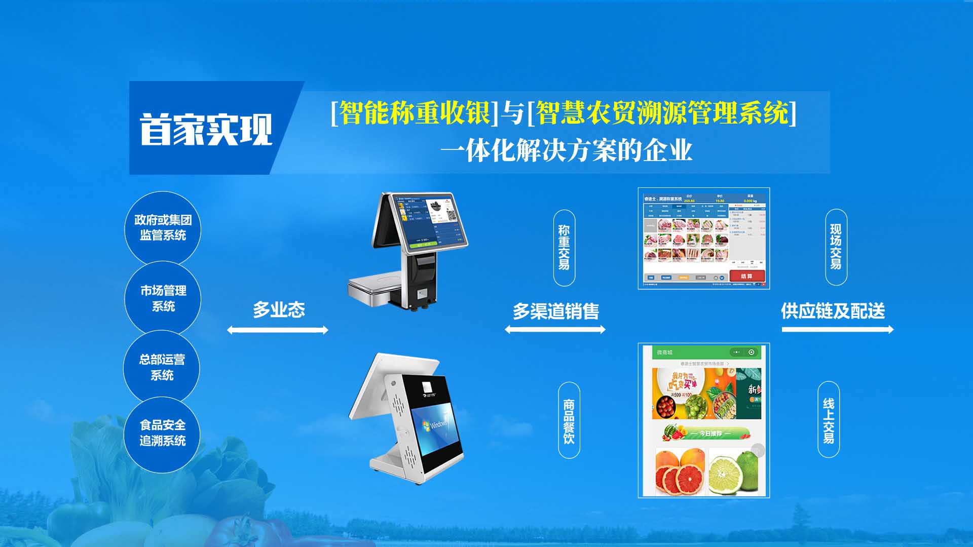 創新實現了【智慧農貿溯源管理系統】與【智能稱重收銀】一體化解決方案,集市場管理、運營管理、溯源追溯、智能收銀大數據運用于一體,硬件、軟件與管理系統完美結合。適用于農批、農貿市場蔬菜、生鮮、水果、水產、肉類、熟食等稱重和非稱重銷售;由于采用一體化設計,解決了傳統農貿市場無法實現的信息化、智能化、可追溯的管理問題;使稱重、收銀、追溯、管理、更透明、公正、安全,讓顧客無后顧之憂,給管理工作帶來極大的便捷與高效,對國內農產品行業的發展、農產品流通管理起到了典范作用。